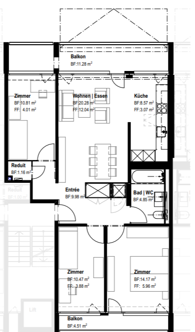 Für Ihre Wohnqualität: - Wohn-/Schlafzimmer und Küche mit Parkettboden - Moderne Küche mit Geschirrspüler, Glaskeramikkochfeld, Backofen und Steamer - Bad/WC mit Plattenboden - Eigener Waschturm in der Wohnung - Einbauschränke im Korridor - Reduit - Kellerabteil - Zwei Balkone